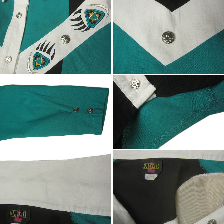 USA古着。WILDFIREの、レディース サウスウエスタンシャツ。■状態について■表面に毛羽立ち・薄っすらとした色褪せあります。襟に、薄っすらとした薄茶色の斑な変色が若干見られます。裾右サイドの生地端ロックステッチに、多少縫い外れを起こしている所があります。