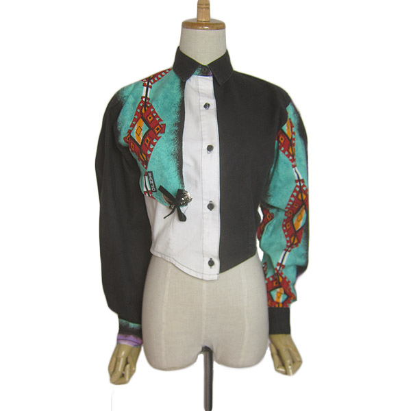 ■状態について■表面に毛羽立ち・色褪せ・軽い汚れ感あります。白生地の全体的に、薄っすらとした汚れを感じ、右前裾周りに、薄茶色の擦れ染み汚れが見られます。★ポイント★USA古着。BANJOの、レディース サウスウエスタンシャツ。ボタン式