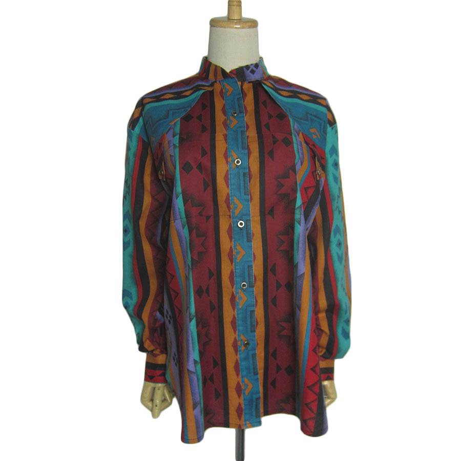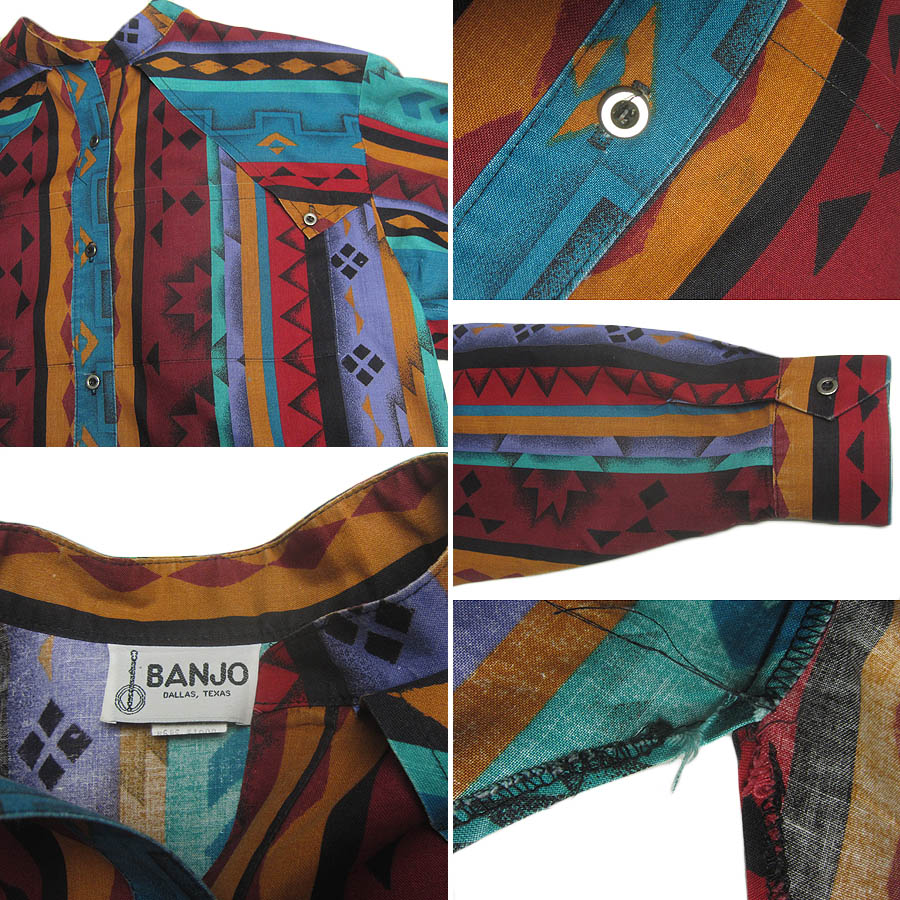 USA古着。BANJOの、レディース サウスウエスタンシャツ。ボタン式。■状態について■表面に擦れ・色褪せ・多少の毛羽立ち、フロント第2ボタン横辺りに、薄黒い軽めの汚れが見られます。裾のサイド縫い合わせ部分の作りが、やや粗めです。