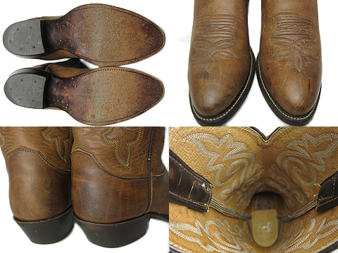 商品番号: wb-238 \10,500 売り切れ ■ブランド■Justin ジャスティン ■製造国■USA製 ■(表記とそれに基づく変換サイズ) 9B→約25.5cm位の方にオススメ ■採寸■計測方法 総丈 約36.0cm, 履き口周り 約37.0cm, ソール最大幅 約9.9cm, ワイズ 約28.0cm, ヒール高さ 約4.3cm ■甲部分=本革・上部=本革 ■レザーソール ■状態について■ ★総合★中古品ですので使用感はありますが、使用上問題となるような損傷は見当たりませんでした。 ★表面★甲にシワ、つま先・かかと周りに擦れ・擦れ汚れ、かかと部分に多少の擦り傷・引っ掻き傷、左足甲正面と上部左足内側面・右足外側面に有刺鉄線にでも引っ掛けた様なチョコチョコとした細かな引っ掻き傷が多々、サイドパイピングにヒビ割れあります。(写真参考) あまりにも神経質な方はお控え下さい。 ★ソール及びヒール部分★ソールは85%程度の使用感で、ヒールゴム部分に多少磨り減りは見られますが、まだまだいけます。 ★靴の中★本革ライナーに使用感、表面に多少の擦れ汚れはありますが、特に問題ありません。 ★ポイント★USA古着。Justin製、ウエスタンブーツです。総本革製になります。ワイズ表記がBサイズの、やや幅狭のスタイルになります。 |