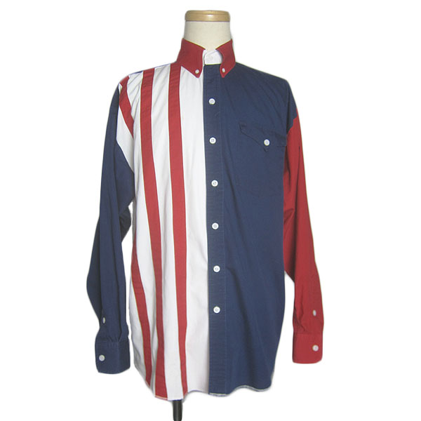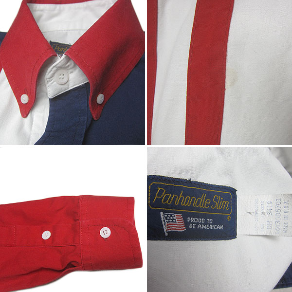 ■ブランド■Panhandle Slim■製造国■USA■表記サイズ■15 1/2×34(目安:M)■計測サイズ■*肩幅 約54.5cm*袖 約59.0cm*着丈 約76.5cm*身幅 約59.0cm■素材■100% COTTON ■状態について■表面に毛羽立ち・色褪せ、右胸の赤ライン際に、1cm範囲程の薄茶色い染み汚れが見られます。★ポイント★USA古着。Panhandle Slimの、星条旗カラー ウエスタンボタンダウンシャツ。