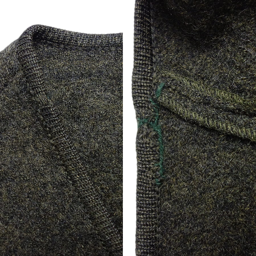 右首元の縁取り部分に、解れを手マツリで補修したリペア痕が見られます。